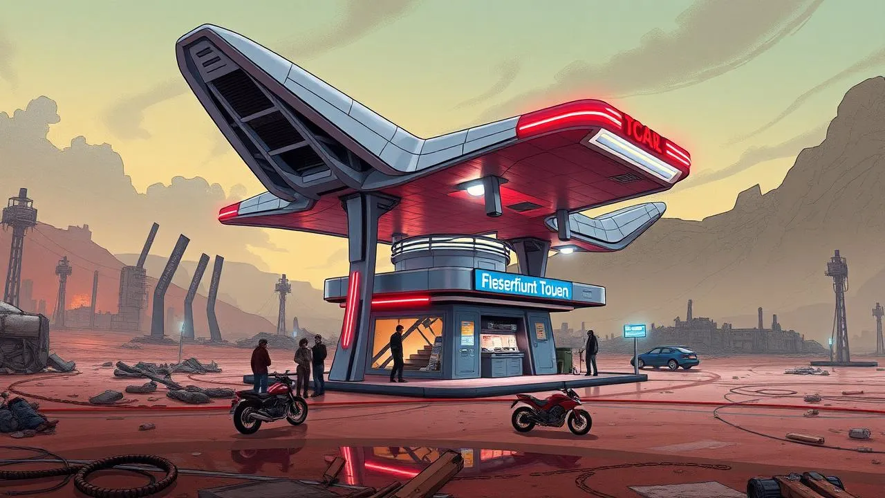 Description: Dans un monde post-apocalyptique, une station-service devient un point de repère crucial pour un père et son fils en quête de survie. Elle symbolise l'espoir et la civilisation perdue.