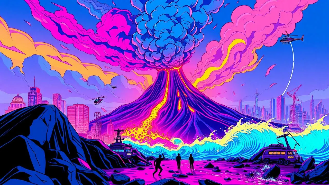 Description: Un volcan entre en éruption dans une petite ville, illustrant les dangers et les conséquences d'une éruption volcanique.