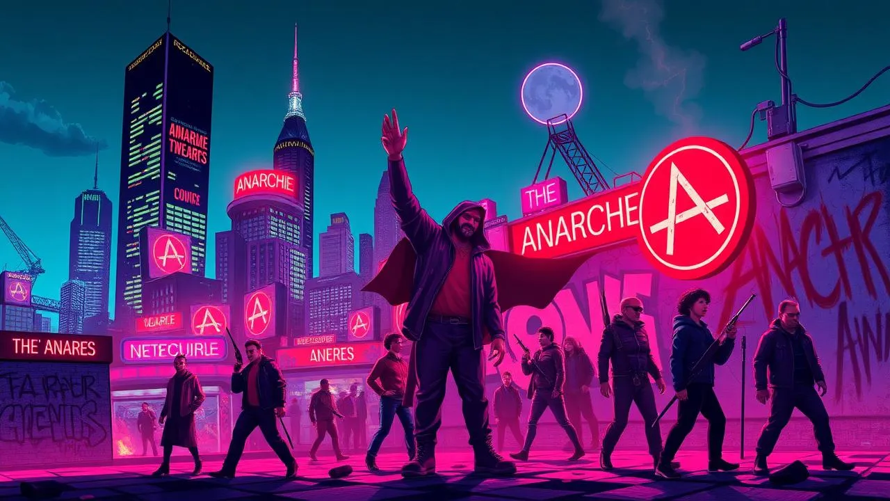 Description: Dans un futur dystopique, un anarchiste masqué lutte contre un régime totalitaire, symbolisant la lutte pour la liberté et l'anarchie.